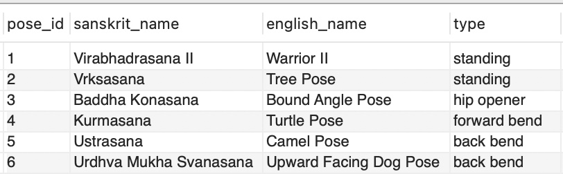 Here is the table that we will be starting with for our examples. The table is named “yoga”: