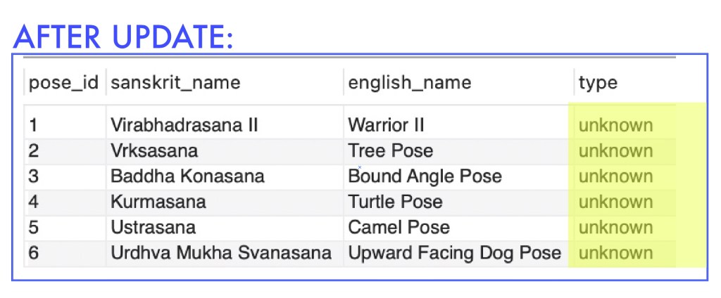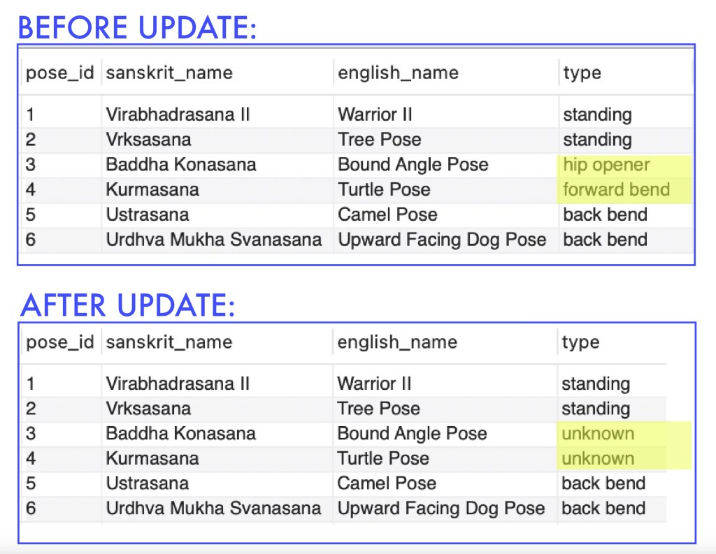 Our next example will update the type column in the yoga table for the fields that are currently populated with ‘hip opener’ or ‘forward bend’ and modify them as ‘unknown’: