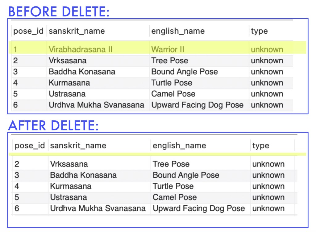 This next example will delete the row from the yoga table where it meets both of the criteria indicated for where the sanskrit_name is ‘Ustrasana’ and the english_name is ‘Camel Pose’: