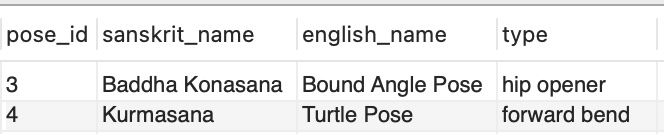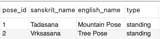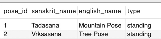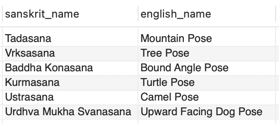 The next example indicates that we only want to query data from the sanskrit_name and english_name columns from the yoga table: