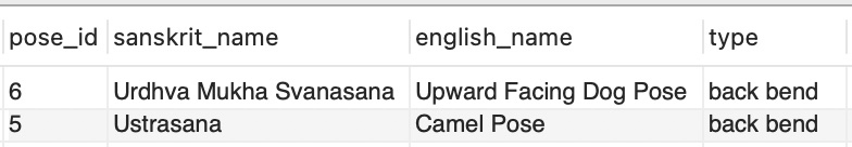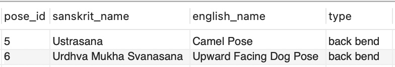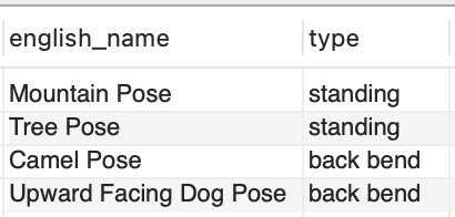 In the following example, we are stating that we want to retrieve the english_name column and type column from the yoga table where the type is either ‘standing’ or ‘back bend’: