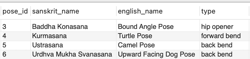 Let’s see an example using some of these comparison operators to filter our records in a query. Below we are querying data from all columns in our yoga table for records where the pose_id is greater than or equal to 3 and the type is ‘back bend’: