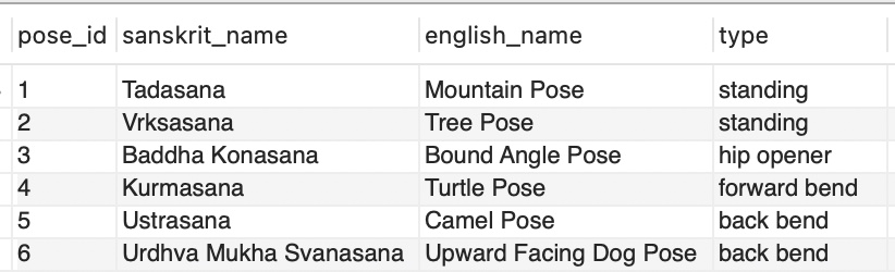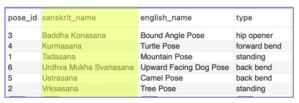So, if we run the below query, it will return data from all the columns in the yoga table, but it be ordered in ascending order (alphabetical) based on the sanskrit_name column (Notice that we do not have to type ASC after sanskrit_name):