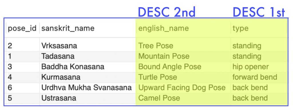 For the next example, we will look at how you can use the ORDER BY clause for multiple columns. We will be selecting the data from all the columns of the yoga table. Then we will first order the data by the type column in descending order, and then by the english_name column in descending order.