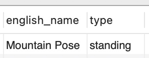 Below, we are filtering out our records even further from our previous example with our WHERE clause by stating that the english_name column must also be ‘Mountain Pose’: