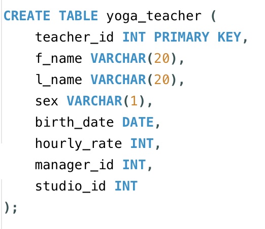 If we refer to the image of our schema at the very top of this post, we’ll see that the manager_id and studio_id column are foreign keys for the yoga_teacher table, but in the above code, they are not indicated as such. This is because the tables being referenced do not exist yet, so we can’t set them as foreign keys right away and we’ll have to define them later on.