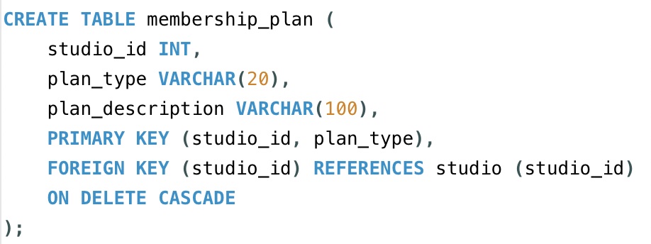 Now, let’s create our last table, membership_plan. Like the previous table we created, this one also has a composite key, which is made up of the studio_id and plan_type columns. However, this time, we only have the studio_id serving as the foreign key and we will also set this for ‘ON DELETE CASCADE’.