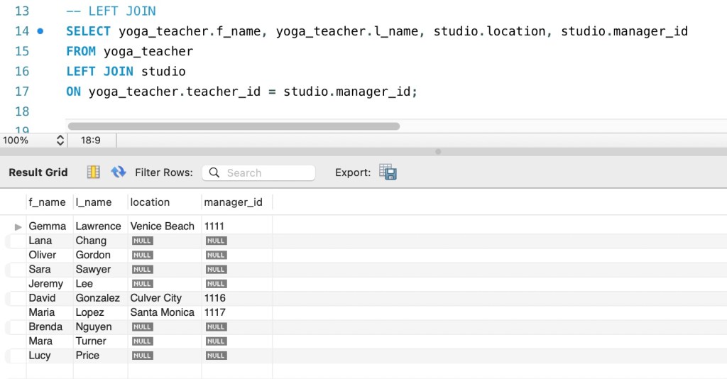 Alright, we’ll start with INNER JOIN. Note that you can also type this as JOIN or INNER JOIN in the statement (they are interchangeable). The example below is retrieving the data from the f_name and l_name columns from the yoga_teacher table, as well as the location and manager_id columns from the studio table. Notice that the columns are prefixed with the appropriate table name for clarity on where to get the requested data. The table indicated by the FROM clause is considered the left table, and the table indicated by the JOIN clause is the right table. Through the INNER JOIN, we are retrieving the records that match the condition indicated after the ON clause. In this case, the condition is where the teacher_id from the yoga_teacher table matches the manager_id in the studio table, which results in the three records shown. This identifies the names of all the managers with their ids, as well as which location they manage.