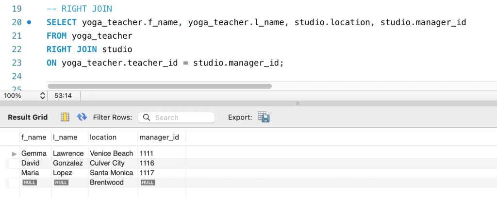 Our final example shown below is for SELF JOIN, where we are joining the yoga_teacher table to itself in order to compare rows from the same table. Because we are using the same table name for the left and right, we need to assign an alias for each in order to be clear on which copy of the table we are referring to. So, the left table here is given the alias a, and the right table has the alias b. We are requesting data from the teacher_id, f_name, l_name, studio_id columns from table a, but only for records where the teacher_id from table a matches the manager_id from table b. The results show three records, which identifies the names and ids of all the teachers that are also managers, as well as which studio they manage. Note that by stating SELECT DISTINCT, we only return distinct values.